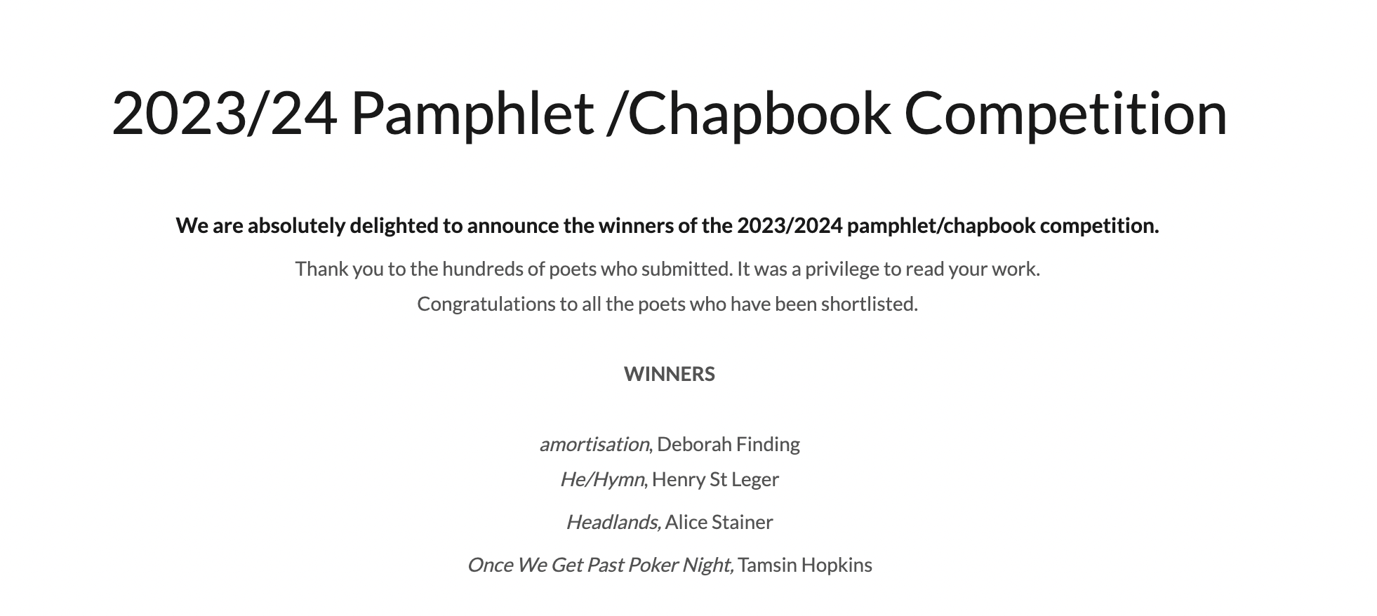 Deborah's second pamphlet 'amortisation' has been chosen as one of the winners of the Live Canon pamphlet competition, and will be published later this year.