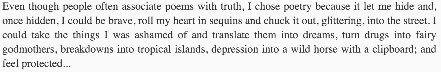 Caroline Bird has said this in lots of different ways, including of course in her poem 'Fancy Dress' from The Air Year, but this explanation in this introduction to her 'selected poems' collection Rookie is particularly lovely...